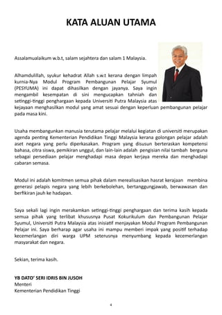 Sediakan teks ucapan selengkapnya. Salam Sejahtera Saya merasa amat bangga dan bertuah apabila diminta memberi kata-kata aluan dan sokongan kepada Persatuan Bekas Polis Malaysia PBPM terhadap usaha murni mereka untuk memberi kebajikan kepada ahli-ahli persatuan khasnya dan kepada masyarakat amnya. KATA-KATA ALUAN DEKAN SEKOLAH PENDIDIKAN DAN PEMBANGUNAN.